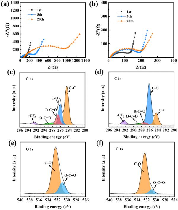 LCO/PEO-LiTFSI/Li电池的阻抗在循环后已经超过900 Ω,阻抗增大表明循环过程中PEO剧烈分解成小分子,导致其离子电导率下降,并且电解质/正极界面也不断被破坏,进而导致电池容量的快速衰减和失效。