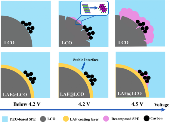 材料,改善电解质-正极界面稳定性,大大提升了PEO基固态电池在高电压下的电化学性能。同时,对PEO基固态电池在不同电压下的失效过程和原因进行分析。