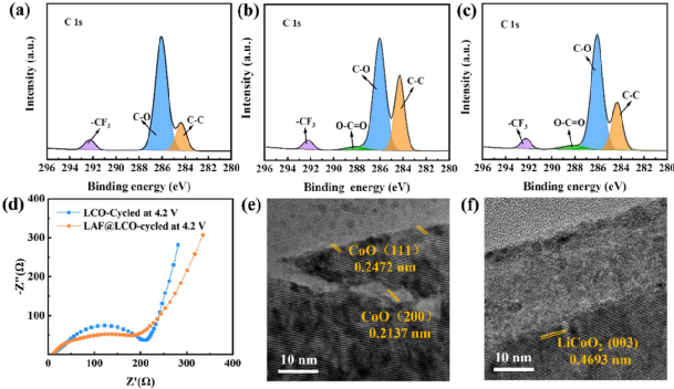 进行的结构分析发现,未包覆的LCO在循环后表面出现了一组不同的晶格条纹,晶面间距为0.2472 nm和0.2137 nm,分别对应CoO的(111)和(200)晶面,这表明循环后的LCO表面发生了明显的结构相变,而这一结构上的变化导致了LCO性能衰减和LCO/PEO-LiTFSI/Li电池的失效。而循环后的LAF@LCO表面仍然存在一层完好的Li