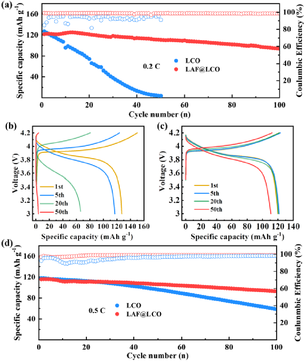 在0.2 C(1 C = 150 mAh/g)的长循环中,LCO/PEO-LiTFSI/Li电池的放电容量从首圈开始快速衰减,在50圈循环之后容量衰减为零。相比之下,LAF@LCO/PEO-LiTFSI/Li电池表现出更加出色的循环稳定性,经过100圈循环后,电池仍然具有高达96.5 mAh/g的放电容量,容量保持率为77.2%。