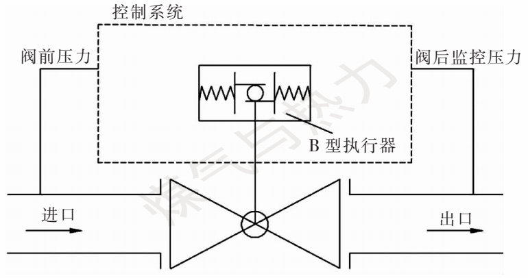 切断阀控制系统主要作用为精准感知下游压力的变化,当下游压力超过切断压力设定值时,能够控制执行器动作,迅速实现切断阀关闭;当故障排除后,人工现场复位,实现切断阀开启。切断阀控制系统见图