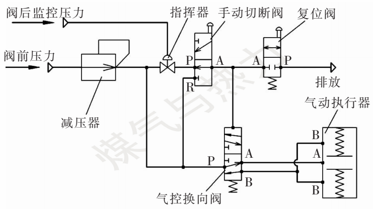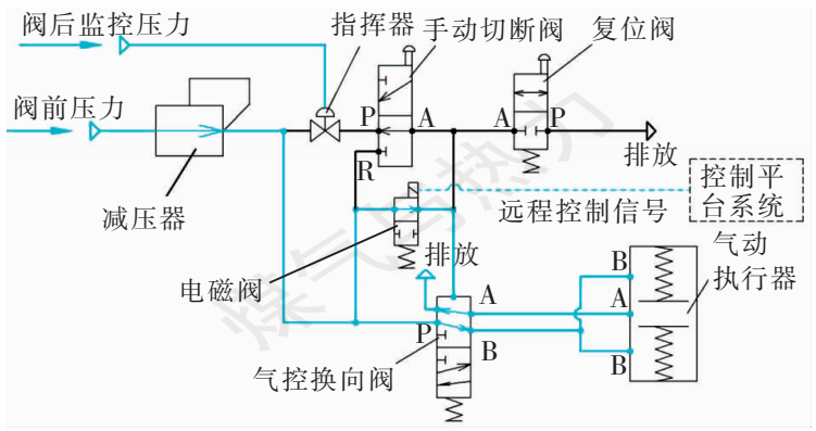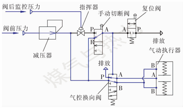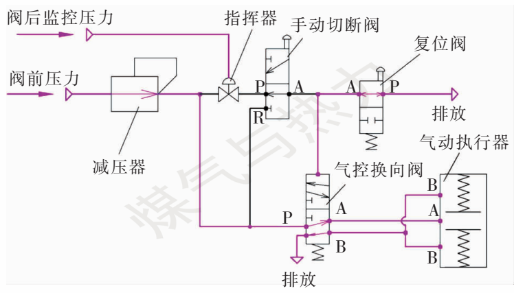 其中,减压器主要作用是将阀前压力降至整个控制系统所需压力,为控制系统提供稳定的动力源;指挥器为压力感知元件,用于感知阀后监控压力并控制指挥器阀口的开关;手动切断阀用于现场手动控制阀门关闭;复位阀用于现场手动控制阀门开启;气控换向阀用于控制并维持阀门开启或者关闭状态;气动执行器用于执行切断阀开关动作。