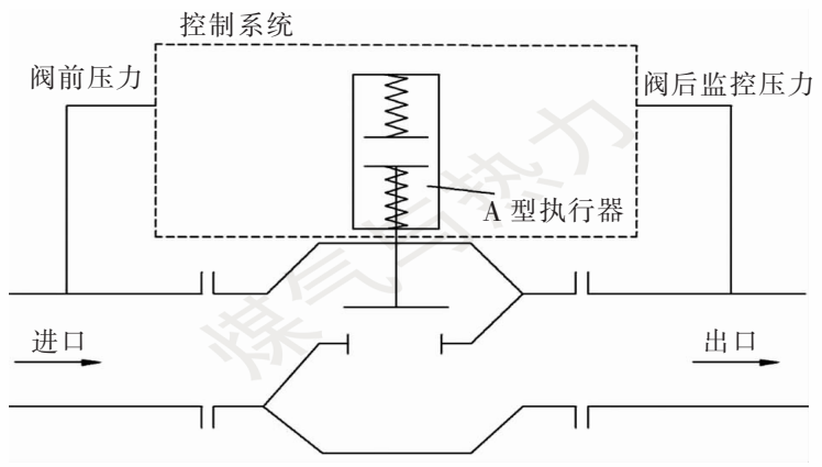 为:切断阀出口压力由信号管引入控制器作用在感应元件上,此力与感应元件另一侧的调节弹簧设定力相平衡。当燃气输配系统出现故障,切断阀下游取压点处的压力超出调节弹簧设定力对应的压力后,触发机构脱扣,执行器带动闭合元件向下移动,闭合元件与阀体贴合,阀门迅速关闭,从而切断上游燃气向下游输送,保护下游设备及管道的安全。当故障排除后,由人工现场拨动复位装置,触发机构上扣,阀门打开,稳定向下游供气。