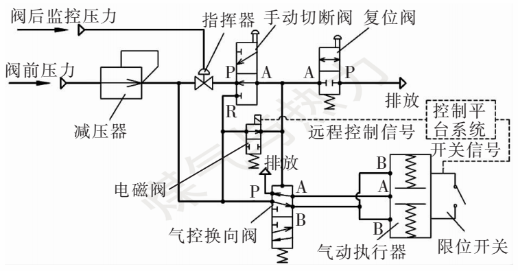 。本文对气动执行器进行改进,增配限位开关。限位开关可以将切断阀的开关信号实时传输到控制平台系统。