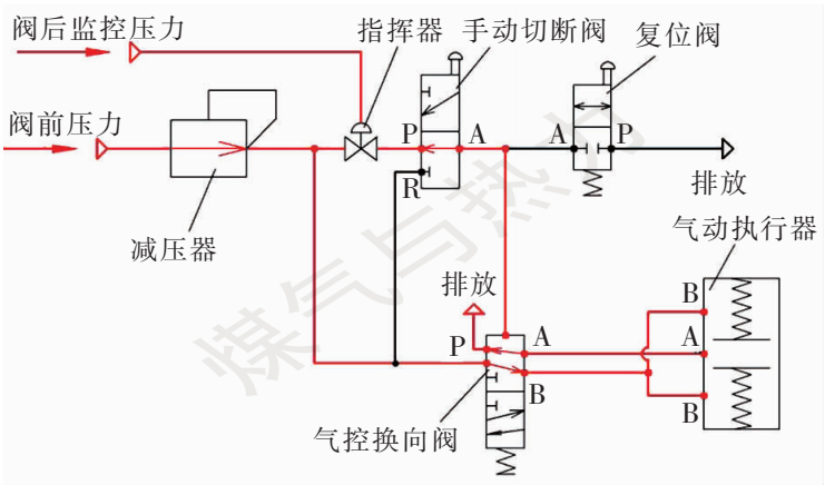 中的红色流程线。当阀后监控压力大于切断压力设定值时,指挥器开启,迫使气控换向阀换向,气控换向阀的