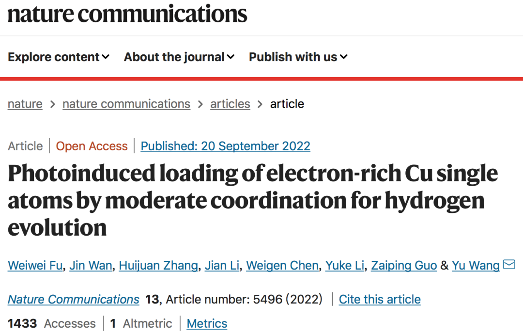 Nature Commun.:光诱导负载适度配位的富电子Cu单原子用于制氢
