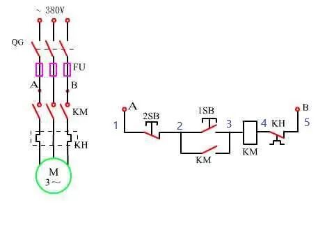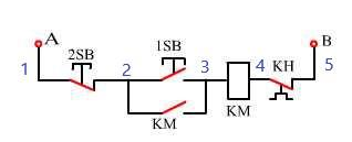 我们假设A处通火线,B处通零线。那么正常情况下,你使用电笔测量图的1、2这两点都是有电的。当你按下SB1后,火线通至KM线圈里。此时,用电笔测1/2/3都是有电的。而4/5是没电的。