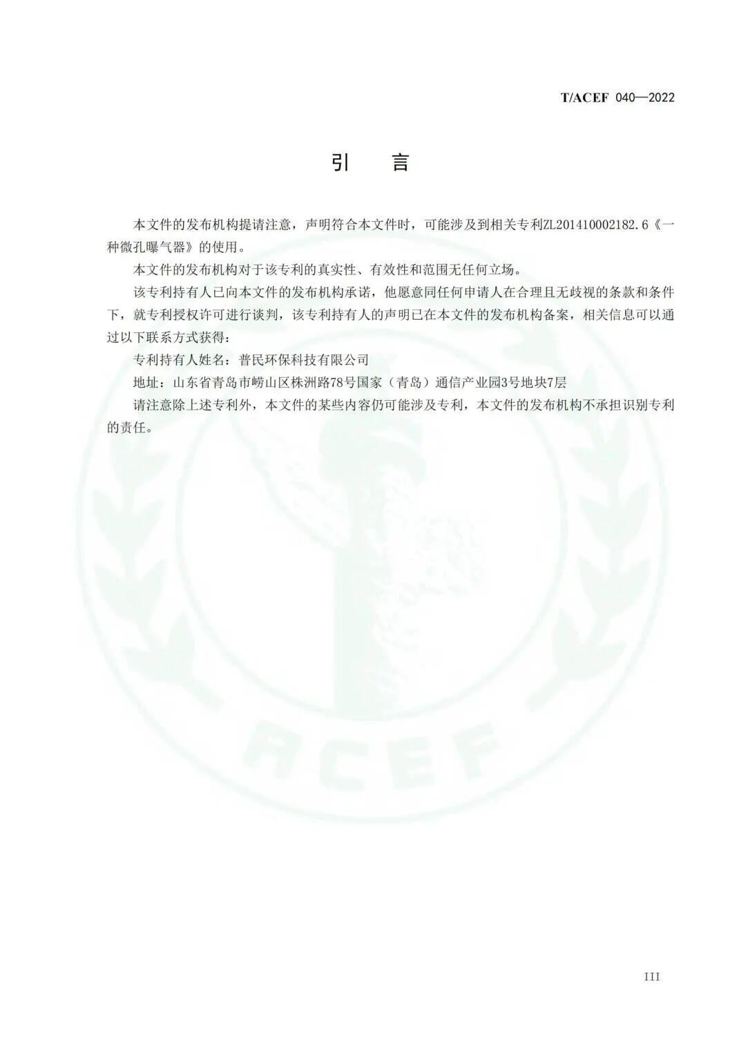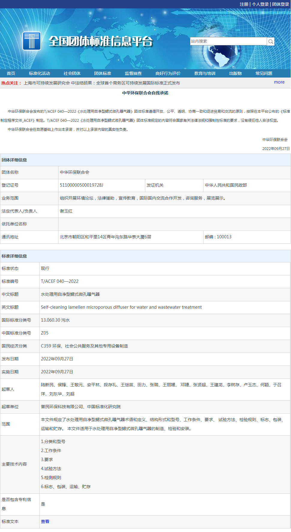 2021年12月,普民环保科技有限公司向中华环保联合会提交了《水处理用自净型鳃式微孔曝气器》立项申请表,经专家评审,2022年1月此项团体标准获得批准立项,项目信息在全国团体标准信息平台网站(http: //www. ttbz. org. cn)予以公示。