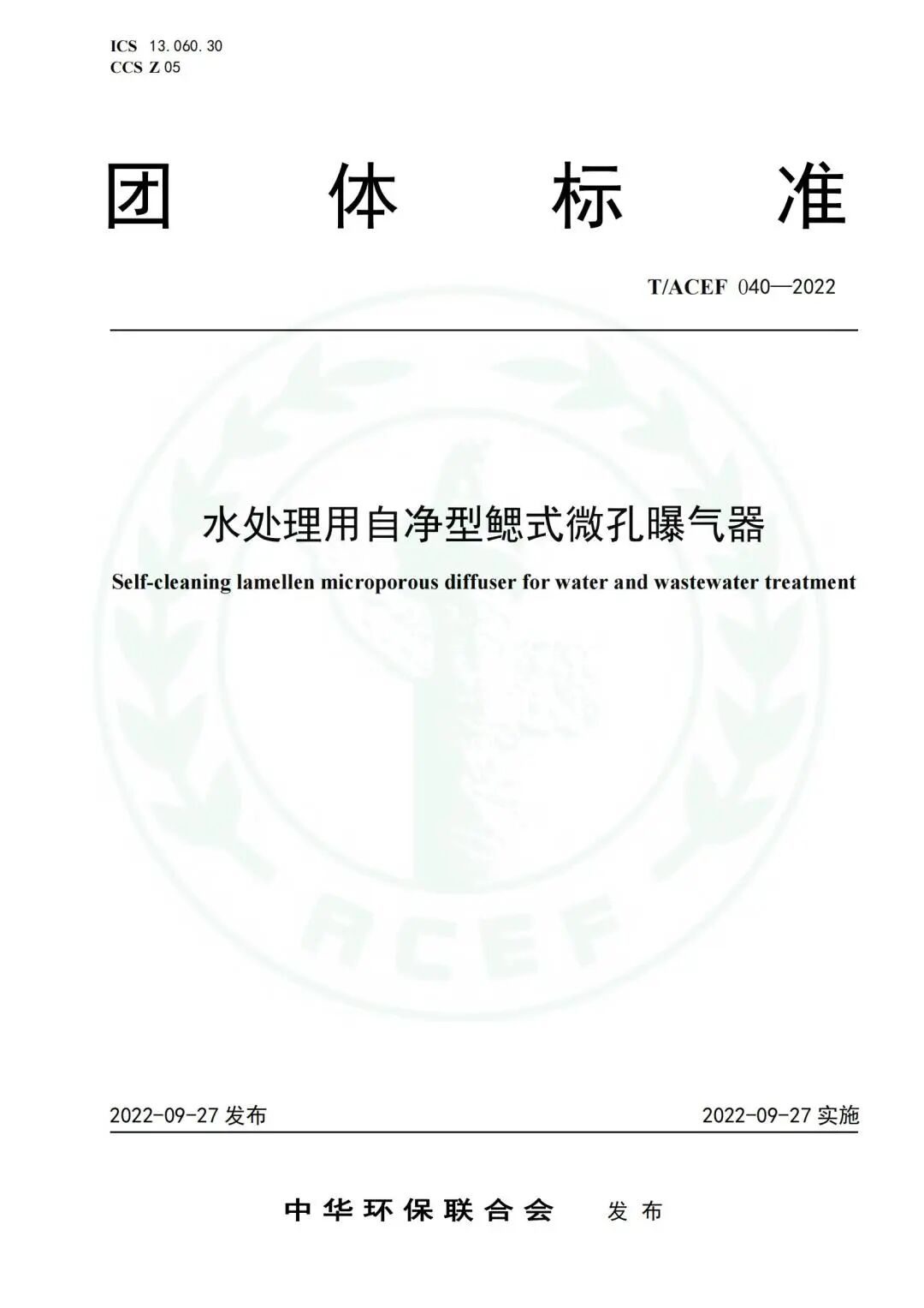日前,根据《中华人民共和国标准化法》以及国家标准化管理委员会、民政部联合制定的《团体标准管理规定》,依据全国团体标准信息平台和《中华环保联合会团体标准管理办法(试行)》, 全国团体标准 《水处理用自净型鳃式微孔曝气器》(T/ACEF 040—2022) 经中华环保联合会批准于2022年9月27日正式发布,自2022年9月27日起实施,批准发布公告和标准文本已在全国团体标准信息平台进行发布。