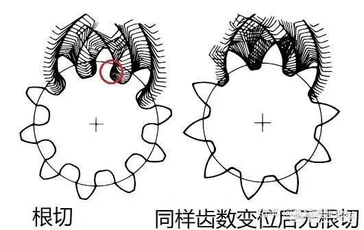 齿轮的齿顶与啮合线的交点超过被切齿轮的极限啮合点时,被切齿轮齿根的渐开线齿廓被切去一部分,这种现象叫根切。