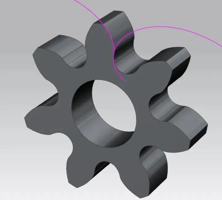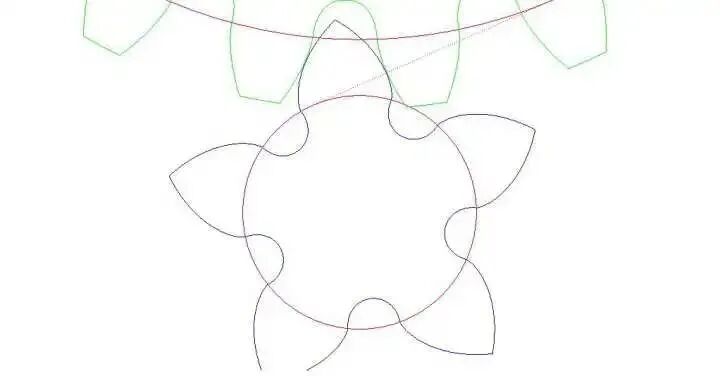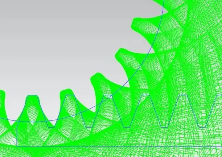 上图中的齿根部分的紫色延伸外摆线的等距曲线就是齿根根切后的齿廓线,一个齿轮的齿根部分根切到什么地步就会影响使用呢?这是由另外一个齿轮齿顶的相对运动和齿轮齿根的强度储备共同决定的,如果配对齿轮的齿顶不会和根切部分啮合那这两个齿轮就可以正常旋转,(注:根切部分是非渐开线齿廓,一个渐开线齿廓和一个非渐开线齿廓啮合在非特异设计的场合通常是无法共轭的,也就是要干涉的)。