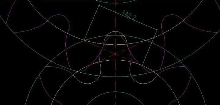 从这张图上可以看出这两个齿轮的啮合线刚刚擦着两齿轮的过渡曲线所对的最大直径圆(注:紫色部分为渐开线齿廓,黄色部分为根切部分,啮合线是不可能进入基圆以下的,因为基圆以下是不可能有渐开线的,两齿轮在任意位置的啮合点皆在这条线上),也就是这两齿轮刚刚可以正常啮合,当然这在工程上是不允许的,啮合线长度为142.2,此值/基节=重合度。