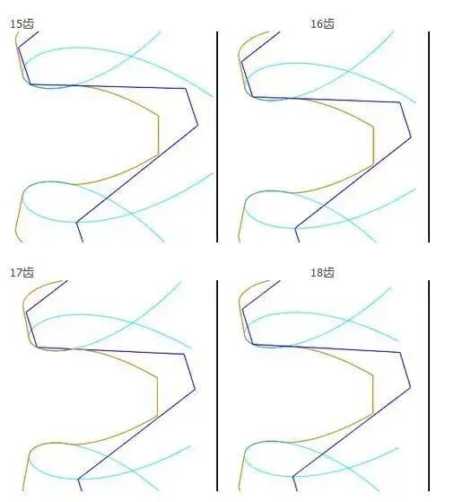 从图中可以看出当用前刀面顶部R角为0的刀具加工齿轮时从15齿到18齿的齿根过渡曲线并没有什么明显变化,那为什么说17齿是渐开线直齿开始发生根切的齿数呢?