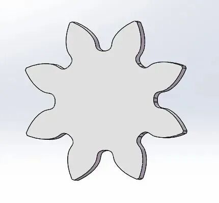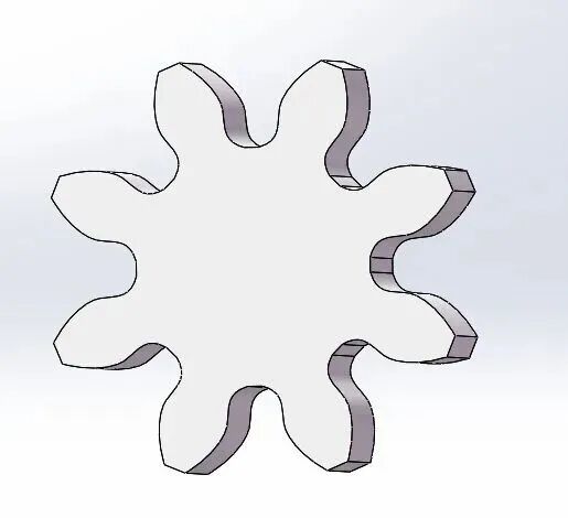 而17是在我国齿轮标准的情况下计算出的极限齿数,齿数小于17的齿轮在使用范成法正常加工时就会出现“根切现象”,这时便要调整加工方法,如变位,如图为变位加工的2模8齿齿轮(小根切)。
