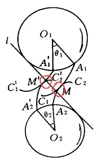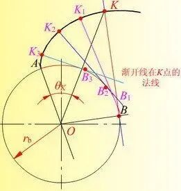 渐开线用一句话说就是假定一直线和其上一不动点,在该直线沿一个圆滚动时,那个不动点所走过的轨迹。它的好处显而易见,当两个渐开线互相啮合时,如下图。