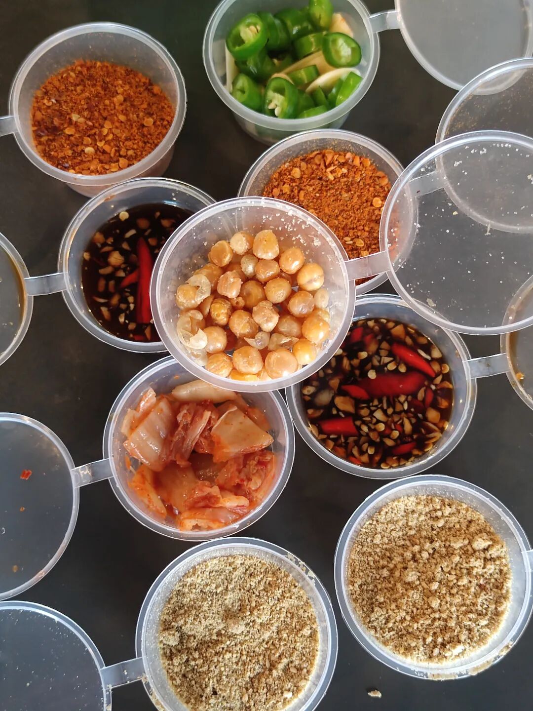 韩式辣白菜+ 香酥花生+大蒜片+青椒圈