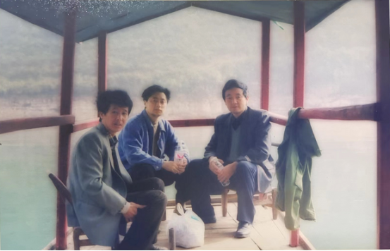文建同志(左一)与同事乘船前往调查点