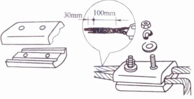连接前,先用钢丝刷除去导线线头和沟线夹线槽内壁上的氧化层和污物,涂上凡士林锌膏粉(或中性凡士林),然后将导线线卡入线槽,旋紧螺栓,使沟线夹紧紧夹住线头而完成连接。为防止螺栓松动,压紧螺栓上应套以弹簧垫圈