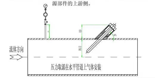3、测量带有灰尘、固体颗粒或沉淀物等混浊介质的压力时,取源部件应倾斜向上安装。在水平工艺管道上宜顺流束,成锐角安装。