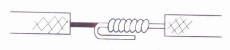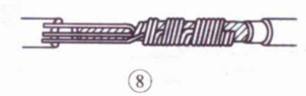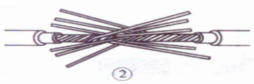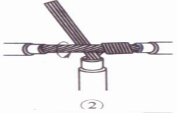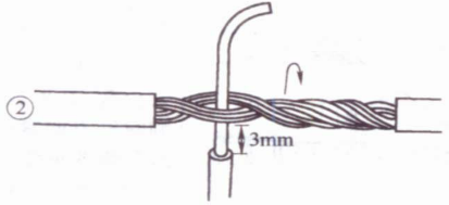 ⑤接着把这两股芯线按顺时针方向紧缠2圈后,再折回90° 并平卧在折起前的轴线位置上。