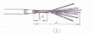 ①先将剥去绝缘层的芯线头散开并拉直,再把靠近绝缘层1/3线段的芯线绞紧,然后把余下的2/3芯线头按图示分散成伞状,并将每根芯线拉直。