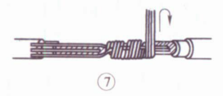 ⑦把余下的3根芯线按步骤⑤ 方法缠绕至第2圈时,把前4根芯线在根部分别切断,并钳平;接着把3根芯线缠足3圈,然后剪去余端,钳平切口不留毛刺