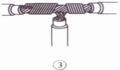 ②把3根线芯的一组在干线右边按顺时针方向紧紧缠绕3~4圈,并钳平线端;把4根芯线的一组在干线的左边按逆时针方向缠绕4~5圈。