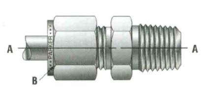 对于已经上紧过的管接头,在拆下前请做好螺帽与接头之间位置的记号,在重新安装时,首先用手将螺帽上紧,再用扳手将螺帽上到原来的位置即可。对于重复拆装多次的管接头,可以在螺帽上到原位置后,再旋转10°~ 20°(不超过六角螺帽一面的1/3,即不超过B处) 。