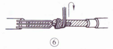 ③将每个线头在另一芯线上紧贴并绕6圈,用钢丝钳切去余下的芯线,并钳平芯线末端。