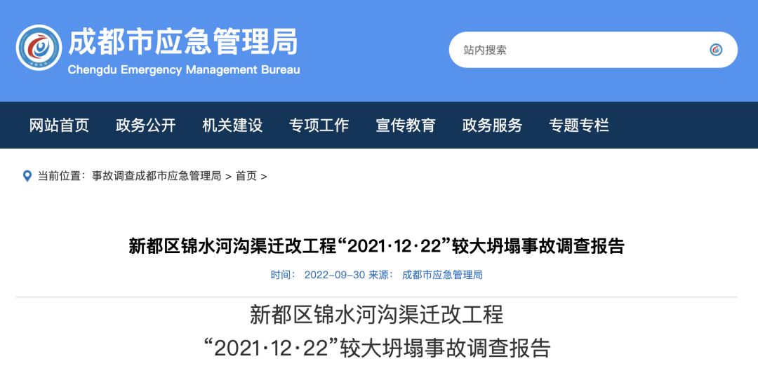 近日,成都市应急管理局发布了《新都区锦水河沟渠迁改工程“2021·12·22”较大坍塌事故调查报告》,2021年12月22日13时56分许,新都区地铁27号线同体工程-锦水河沟渠迁改工程(以下简称锦水河沟渠迁改工程)项目在绑扎箱涵段侧墙钢筋时发生坍塌事故,致使5名作业人员受伤,其中4名重伤员分别于12月22日16时25分、23日10时14分、24日11时03分、24日11时28分经抢救无效死亡,事故共造成4人死亡、1人轻伤,直接经济损失764.3万元。