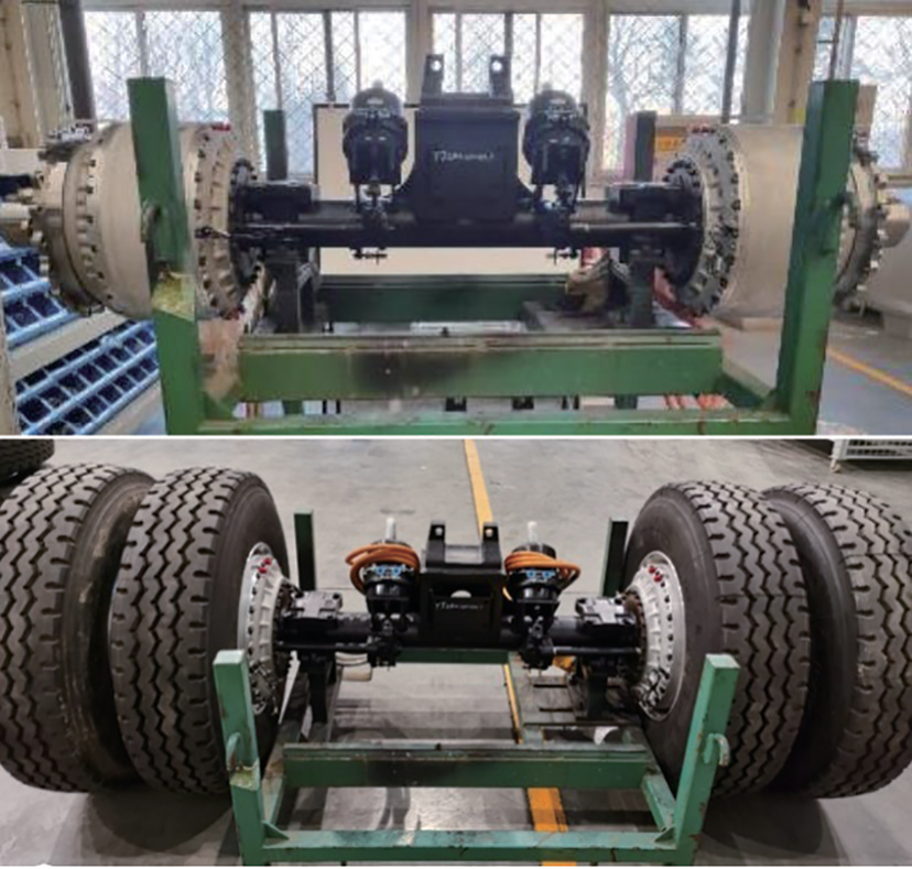 首先,分析论证了分布式电驱动相对于集中式驱动在驱动效率上的优势,考虑传动链优化,系统的驱动效率相比集中驱动可以提升近10%。其次,开展了高转矩密度轮毂电机设计,创新性地提出了弯扭解耦的电动轮构型,结合油冷与桥驱匹配优化,较当前典型电驱桥在驱动转矩与重量方面取得了显著进步,整桥重量与传统集中驱动相当,有效解决了簧下质量问题。最后,基于该电动轮,考虑载荷、性能和装配等因素,开发了双轮并装的轮边驱动电动轮的驱动桥方案。