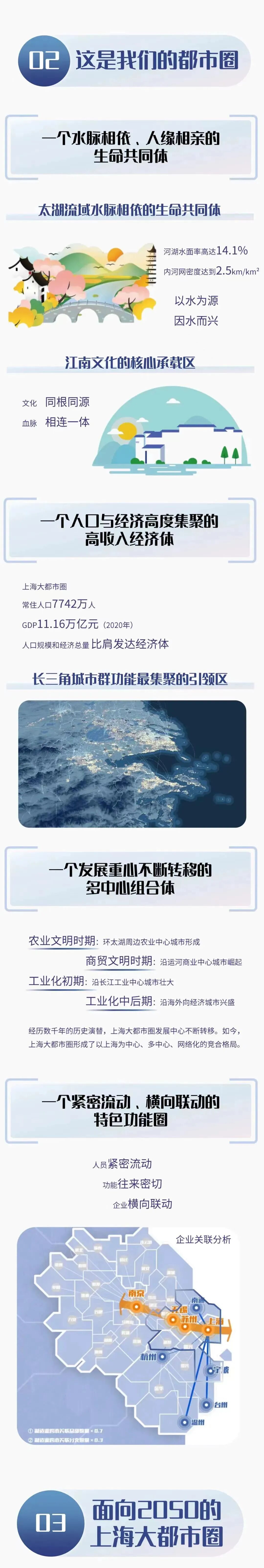 上海市人民政府、江苏省人民政府、浙江省人民政府日前联合印发《上海大都市圈空间协同规划》。本轮规划将上海大都市圈的规划范围确定为上海市以及周边苏州市、无锡市、常州市、南通市、嘉兴市、湖州市、宁波市、舟山市在内的“1+8”城市市域行政范围,总面积约5.6万平方公里,2020年常住人口约7742万人,分别约占长三角的15%和34%左右。规划期限至2050年,中期至2035年,近期至2025年,衔接“十四五”规划。来看图解↓