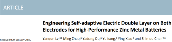 Yanqun Lv, Ming Zhao, Yadong Du, Yu Kang, Ying Xiao and Shimou Chen*,Engineering Self-adaptive Electric Double Layer on Both Electrodes for High-Performance Zinc Metal Batteries, Energy & Environmental Science, 2022.