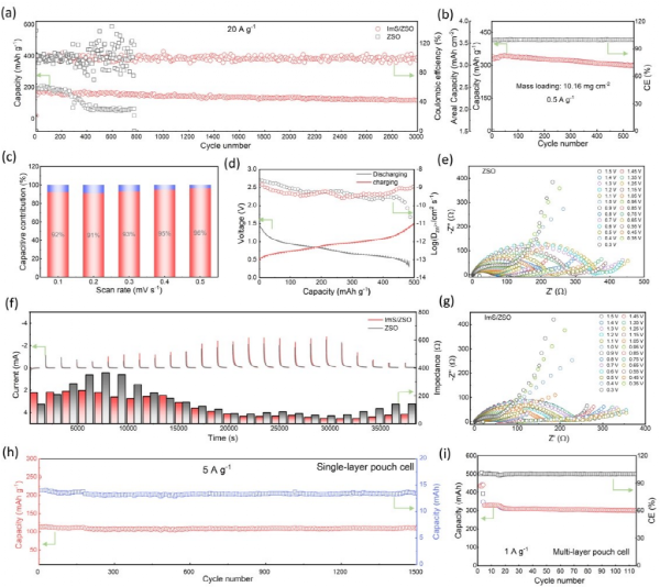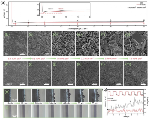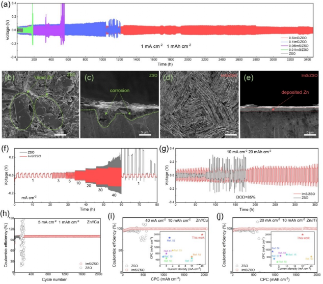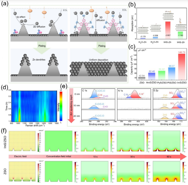 作者对添加剂的保护机制进行了进一步的探讨(图五)。通过DFT计算和原位拉曼分析,相比于水分子,ImS添加剂在锌负极上具有更大的吸附作用,在锌离子的沉积过程中,添加剂逐渐富集在锌负极表面,降低了锌负极表面水的含量。在电场的作用下,添加剂发生定向排列,咪唑阳离子靠近锌负极侧,磺酸根靠近电解液侧,形成自适应的。通过分子动力学模拟发现,定向π-π堆叠咪唑阳离子,形成了一个阳离子型静电屏蔽层,有效的抑制了枝晶的生长;同时靠近电解液侧的磺酸根,能够与锌离子相互作用,提供丰富的锌离子传输通道,均匀锌离子流,同时对硫酸根进行排斥,消除界面极化和副反应。通过添加剂在锌负极表面的定性排列,实现无析氢、无枝晶、抗腐蚀的锌负极。