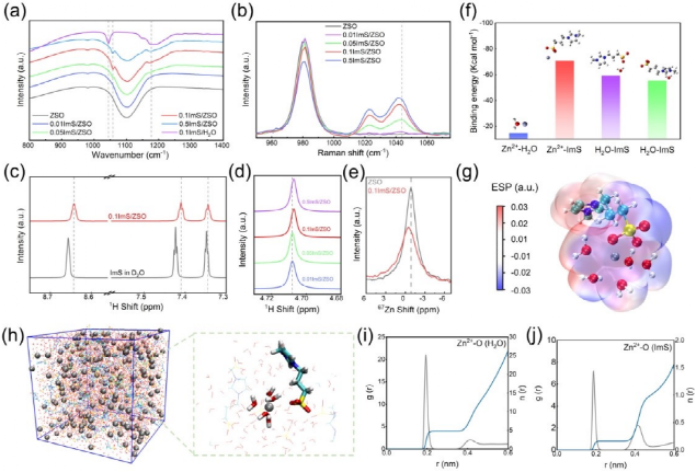 进一步探讨了ZIL对Zn 2+ 溶剂化结构的影响(图二)。通过红外、拉曼分析以及核磁分析,发现磺酸根的特征峰都发生了偏移,反应了磺酸根与锌离子的配位,以及与水分子的氢键作用。通过DFT对不同组分的结合能进行计算,也验证了添加剂能够打破水分子之间的氢键,并与Zn 2+ 发生配位。我们通过MD模拟,对Zn 2+ 的溶剂化层进行了分析,两性离子液体的添加,重构了Zn 2+ 的溶剂化结构,能够改善锌离子的传输,避免了溶剂水分子的副反应。