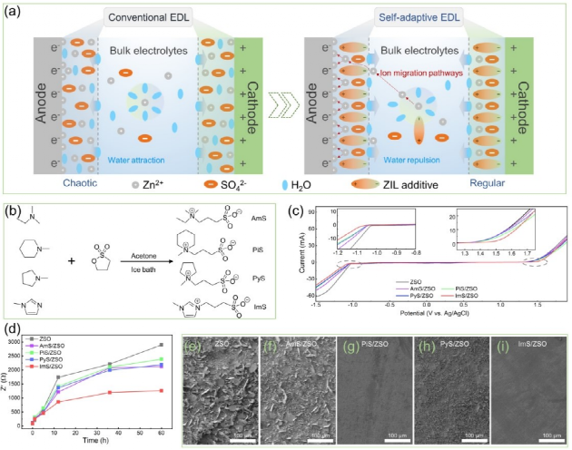 锌金属电池因其成本低、容量大、环保等优点,成为锂离子电池的替代品,受到广泛关注。不幸的是,不可控的枝晶生长、析氢反应和腐蚀严重限制了水系锌电池的实际应用。 目前主要研究的是共溶剂添加剂或阳离子添加剂,而两性离子液体添加剂在锌金属电池中的应用研究较少。两性离子离子液体(ZIL)含有共价结合的阳离子和阴离子基团,具有潜在的电化学应用。