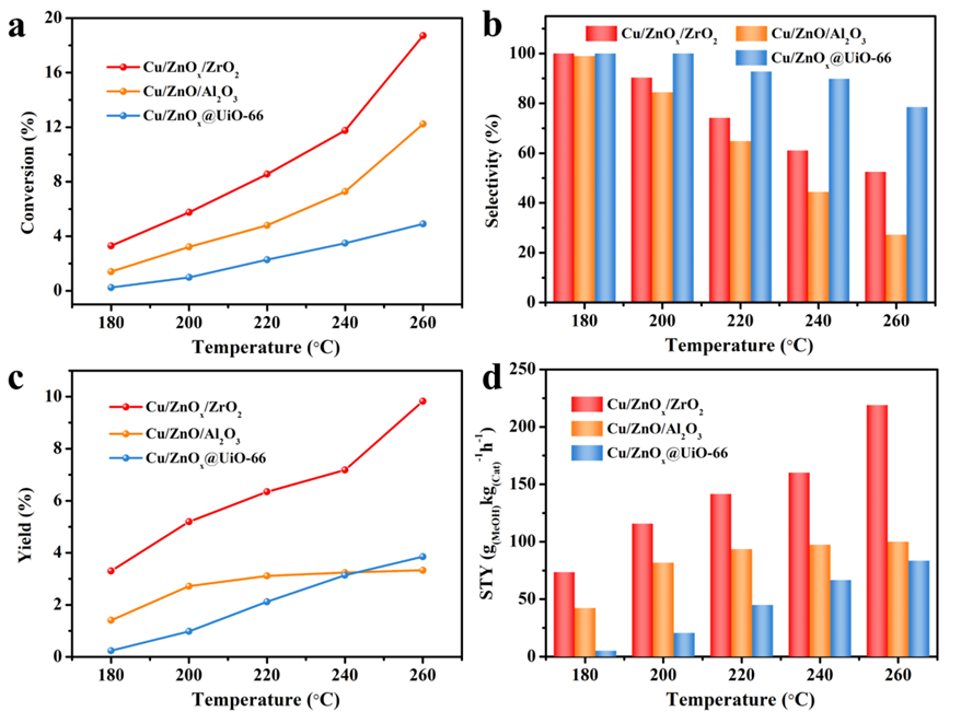 Fig. 4 The relationship between (a) conversion, (b) selectivity, (c) yield, (d) space-time yield and reaction temperature of CO 2 hydrogenation to methanol over Cu/ZnO x /ZrO 2 , Cu/ZnO/Al 2 O 3 and Cu/ZnO x @UiO-66. (H 2 :CO 2 =3:1, P =4 MPa, GHSV=12000 h -1 , m cat =0.3 g)