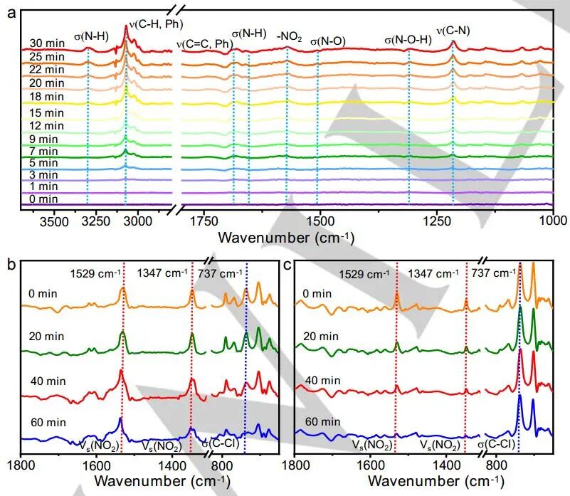 波段,证明了Ph-NO和Ph-NOH中间体的形成。在Ar气吹扫后,硝基苯的信号保持不变,而C-Cl峰逐渐消失,表明在ZIF-8