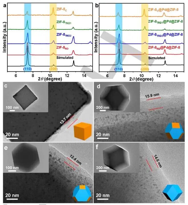 暴露混合(100)和(110)晶面),并将小Pd纳米颗粒(Pd NPs)沉积在ZIF-8核心特定晶面上,用于对氯硝基苯的加氢反应。ZIF-8的不同晶面能够为Pd NPs提供特定的化学微环境,包括(100)面上的Zn