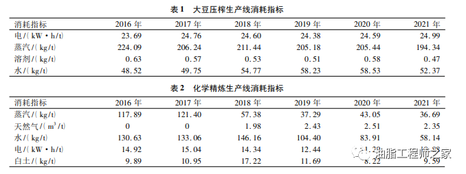 从表 1、表 2 可以看出,整体能耗在下降。白土视大豆品质和成品油质量添加,废白土按环保部门 要求,由具备资质的公司定向处理为肥料。