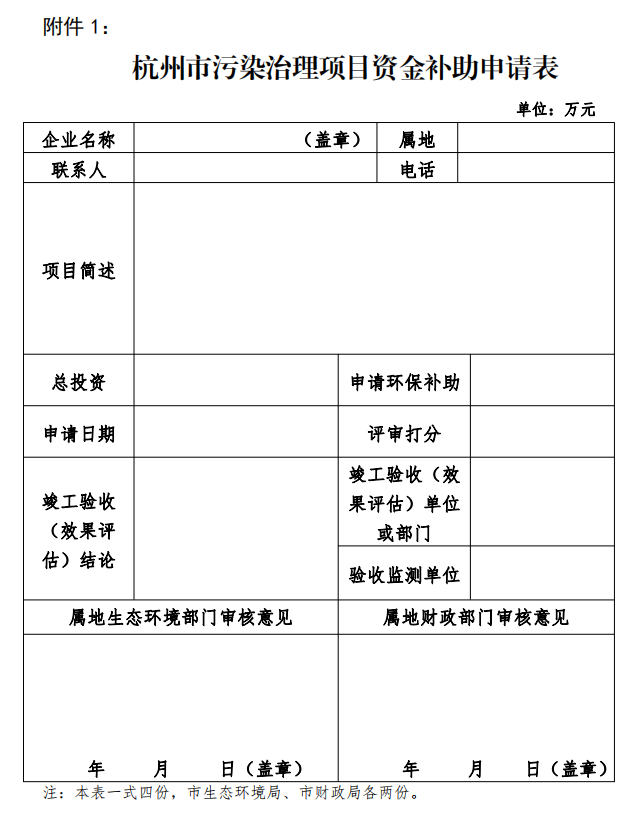(1)杭州市污染治理项目资金补助申请表一式四份;