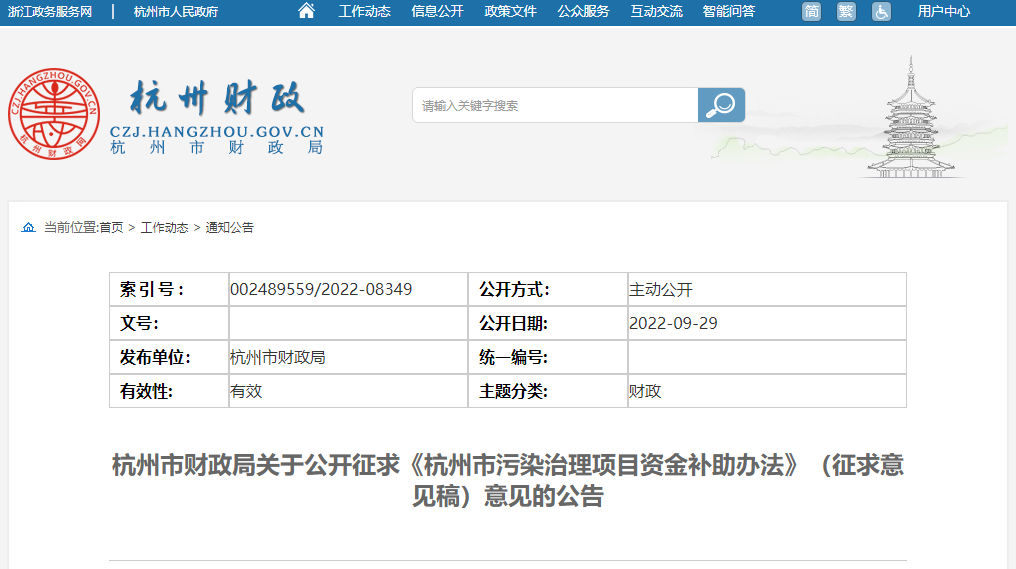杭州市污染治理项目补助专项资金计划在杭州市生态环境局外网公示。