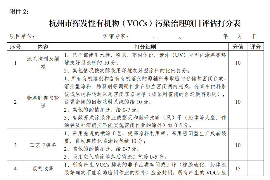 拟新规:最高补助300万元 | 附挥发性有机物(VOCs)污染治理项目评估打分表