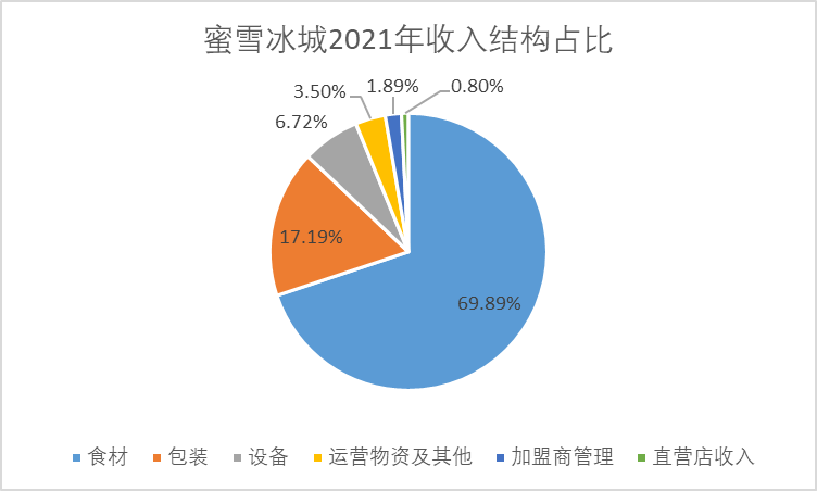 首先需要搞清楚雪王的盈利模式,蜜雪冰城加盟商占比超过了99%,雪王通过销售给加盟商原材料、设备、装修服务等来赚钱,所以说加盟商是雪王的直接客户,通过招股说明书我们可以看到收入结构,近九成收入来自向供应商提供原材料,剩下的为加盟商开店时向其售卖设备、提供装修服务等,收入结构异常清晰。