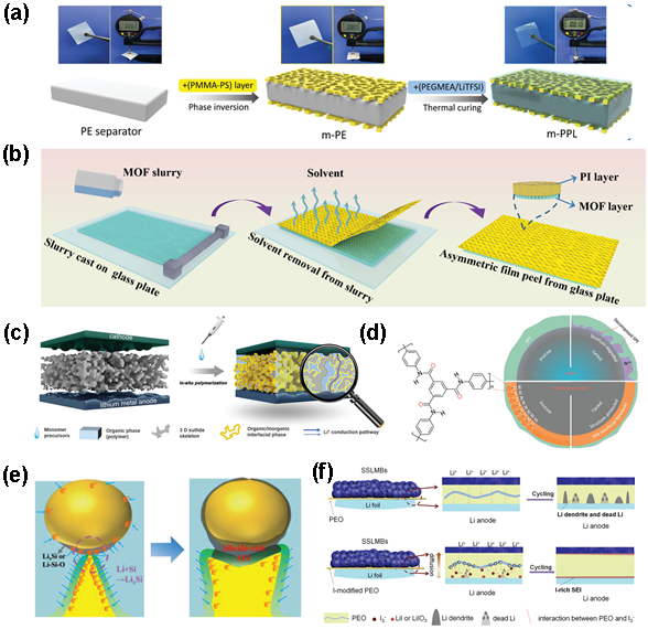 图8. 聚合物电解质相关研究。(a)10 μm厚PMMA-PS-PE复合聚合物膜的制备过程示意图;(b)MOF+聚合物不对称复合SPE制备示意图;(c)具有 3D 硫化物骨架的原位聚合复合电解质制备示意图;(d)NCM和SPE之间有和没有芳香族聚酰胺纳米界面层对循环稳定性的影响示意图;(e)PEO中Si粒子和锂枝晶反应示意图;(f)有和没有 I
