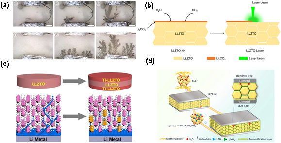 形成和激光清洗过程的示意图;(c)Ti-LLZTO/LLZTO双层电解质抑制锂枝晶生长示意图;(d)LZO 添加剂的作用示意图。