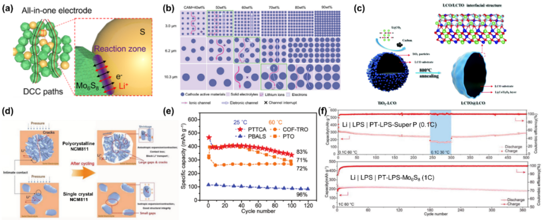 涂层的流程示意图; (d)单晶和多晶NCM811复合正极在电极压制过程和电化学循环过程中的截面形貌变化示意图;(e) 基于PTTCA有机正极的硫化物全固态电池循环性能;(f)基于PT正极和硫化物电解质的全固态电池长循环性能。