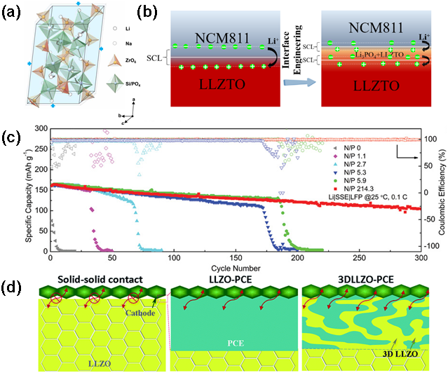 界面层示意图;(c)使用有限的锂金属和LFP在各种 N/P 比下的全固态电池循环性能;(d)不同配置的阴极/LLZO界面示意图。