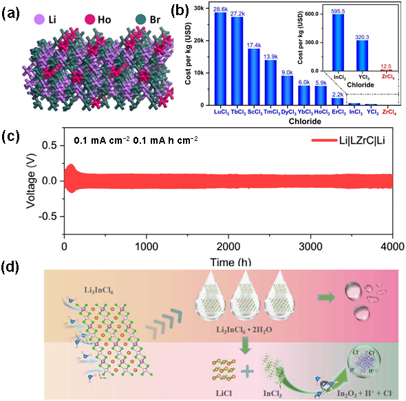 的弛豫结构;(b)合成不同氯化物固态电解质所需的原料价格;(c)Li|LZrC|Li 电池循环曲线;(d)Li