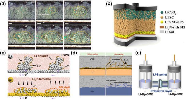 图3. 硫化物电解质和负极界面相关研究。(a)LPS电解质内部锂沉积过程的原位光学观察;(b)Li@LPSNC-0.25||LPSC||LCO全固态电池示意图;(c)LGPS与金属Li或者In负极界面处的锂沉积/剥离差异示意图;(d)循环前后电池中 LPSCl-Li 和 LPSCl-LiIn 界面演变示意图;(e)基于液态Li-Bp-DME负极和硫化物电解质的对称电池模型。